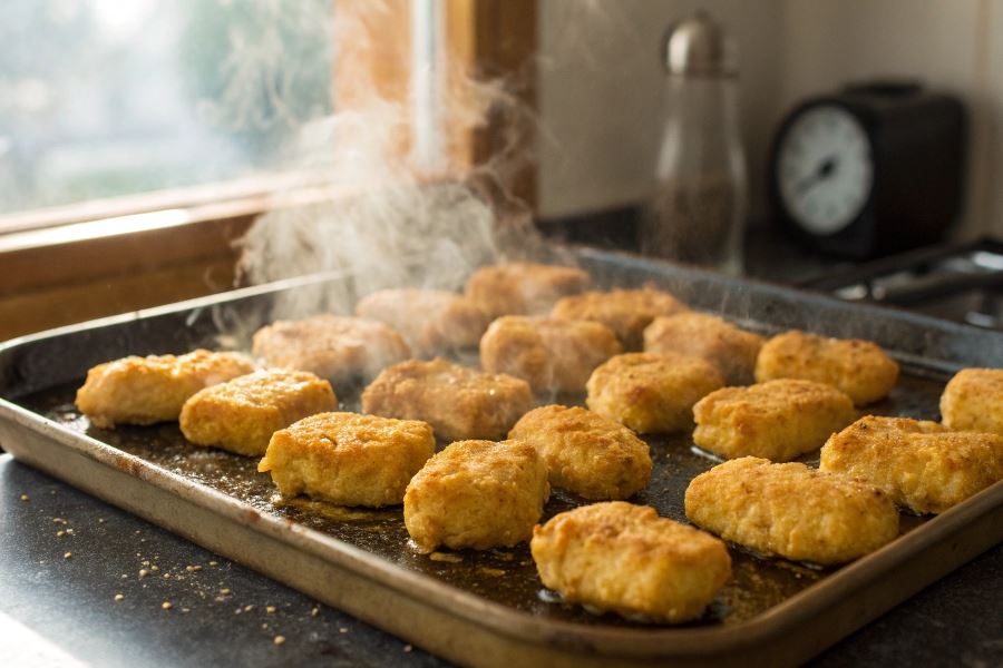 Profesjonalna wskazówka: Przed ułożeniem nuggetsów na blasze, rozgrzej piekarnik do temperatury wyższej o 20°C niż zalecana na opakowaniu, a następnie zmniejsz ją do właściwej po włożeniu produktu. Ten zabieg zapewnia natychmiastowe „zamknięcie” panierki i zachowanie soczystości mięsa.