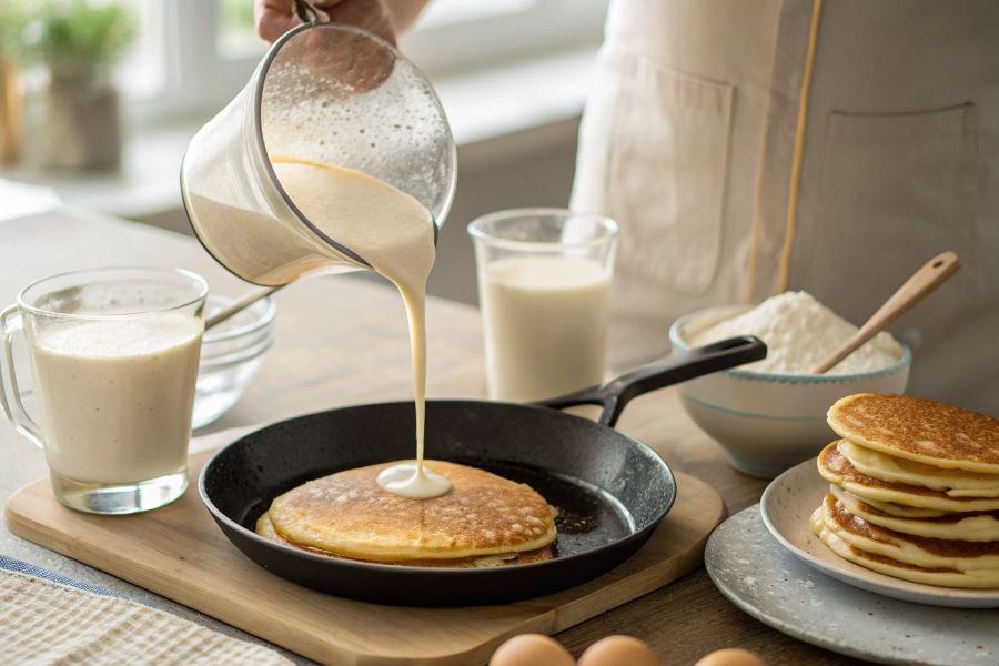 Proporcja mąki do mleka 1:2 zapewnia idealną konsystencję ciasta – ani zbyt gęstego, ani zbyt rzadkiego. Ciasto powinno mieć konsystencję śmietany i łatwo spływać z łyżki, tworząc jednolitą warstwę na patelni.