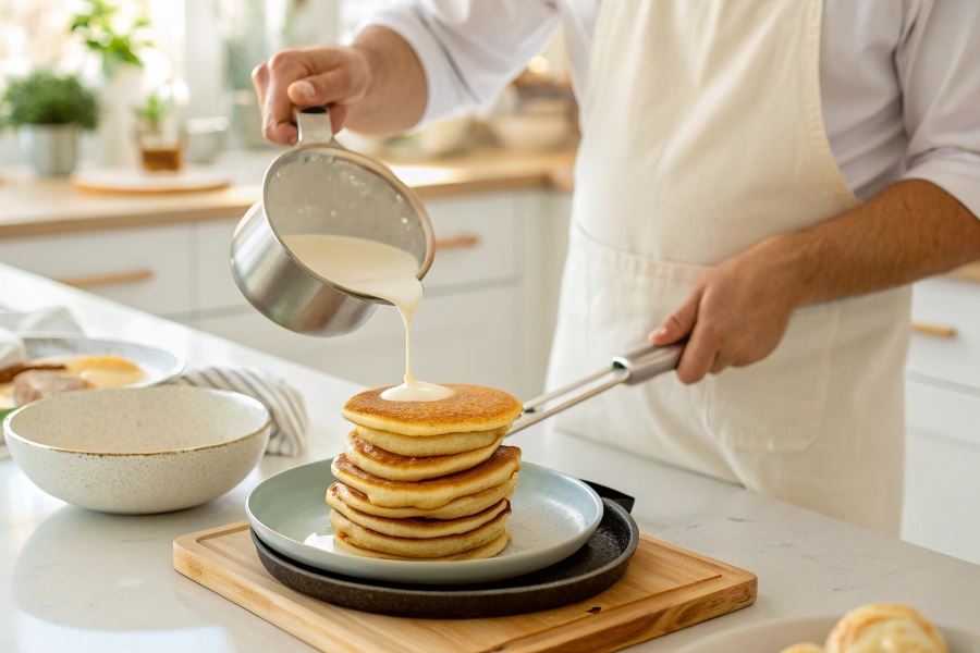 Odstawienie ciasta na minimum 30 minut pozwala mące napęcznieć i uwolnić gluten, co przekłada się na elastyczność i puszystość gotowych naleśników. Jeśli po tym czasie ciasto jest zbyt gęste, można dodać odrobinę mleka.
