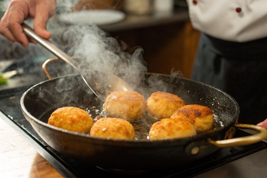 Dobrze wysezonowana patelnia żeliwna nie wymaga dużej ilości tłuszczu, co czyni smażenie krokietów zdrowszym, zachowując jednocześnie ich charakterystyczny smak.