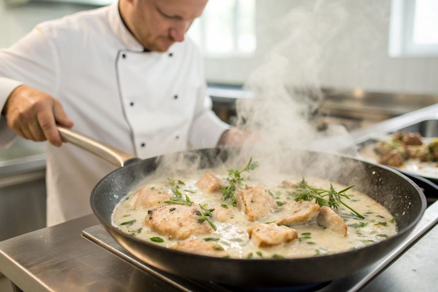 Sekret profesjonalnego sosu tkwi w redukcji płynów przed dodaniem śmietanki. Najpierw zredukuj wino o połowę, następnie dodaj bulion i ponownie redukuj, a dopiero na końcu dodaj śmietankę. Ta technika zapewnia intensywny smak i idealną konsystencję bez potrzeby zagęszczania.