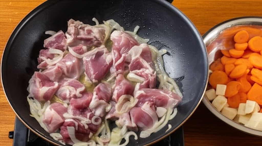 Warzywa opłucz i posiekaj, również dość grubo, z wyjątkiem cebuli, którą pokrój w piórka. Na patelni podgrzej tłuszcz, wsyp cebulę. Zeszklij, lecz nie przyrumieniaj i dorzuć pokrojone w kostkę mięso. Podduś przez około 5 minut.
