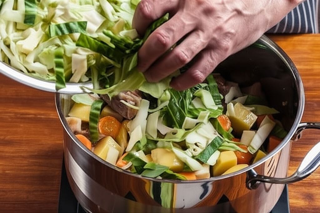 Przenieś zawartość patelni do garnka, zalej bulionem i dopraw. Duś na małym ogniu do miękkości przez ok. 70-90 minut. Dopraw według smaku.