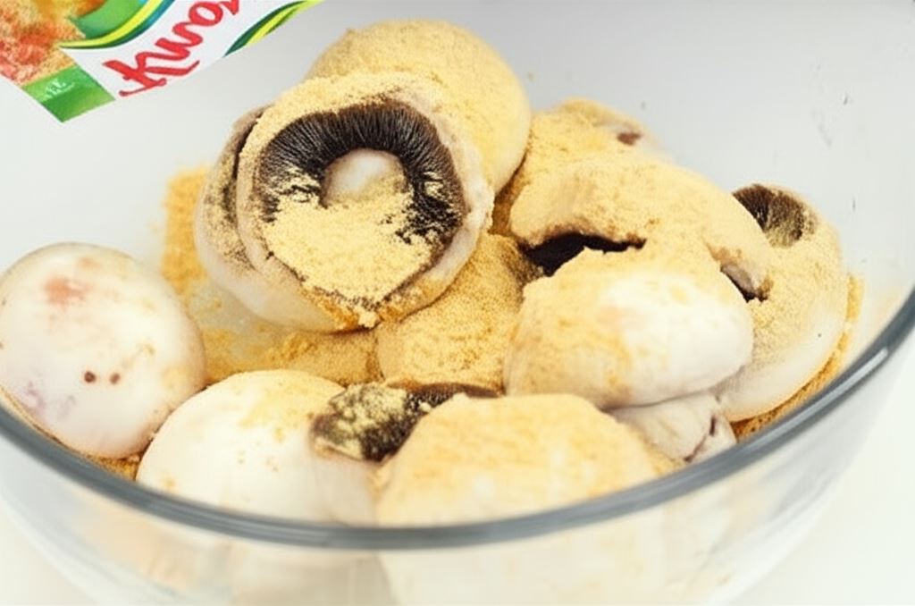 Pieczarki opłucz, odłam nóżki, a mokre kapelusze obtocz, łącząc z Fixem Knorr.