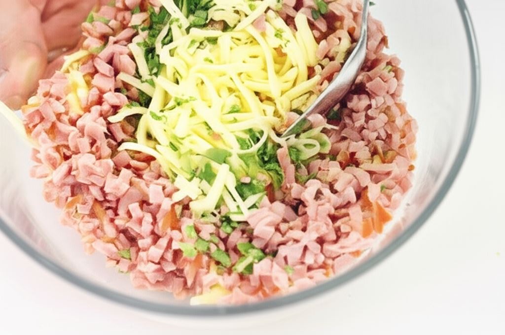 Ser połącz z posiekaną natką pietruszki i pokrojoną na drobną kosteczkę szynką.