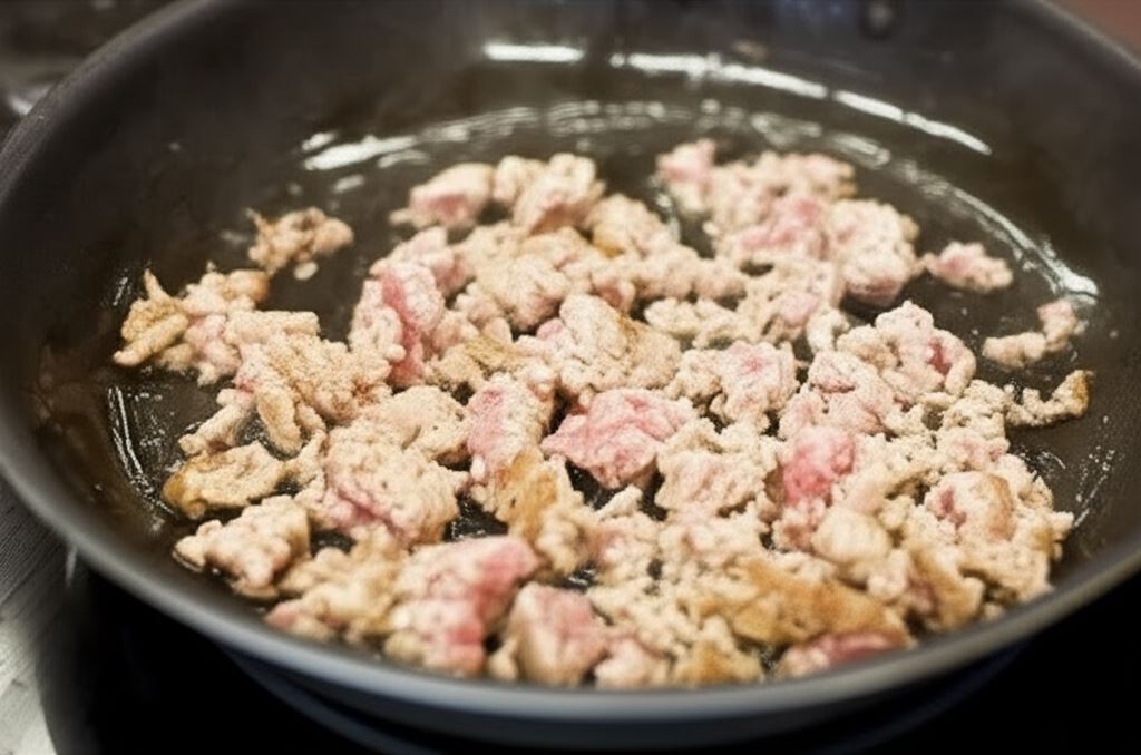 Mięso mielone przyrumień na głębokiej patelni do złocistego koloru.