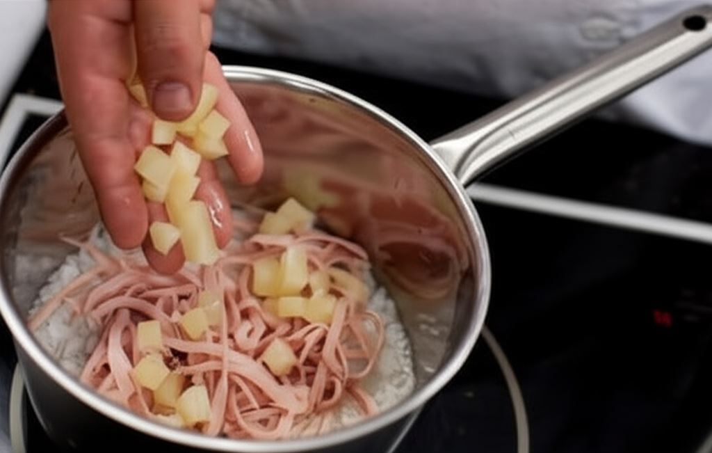 Szynkę potnij w paski, ananasa w kosteczkę. Potem zdejmij ryż z ognia, wsyp szynkę i ananasa.