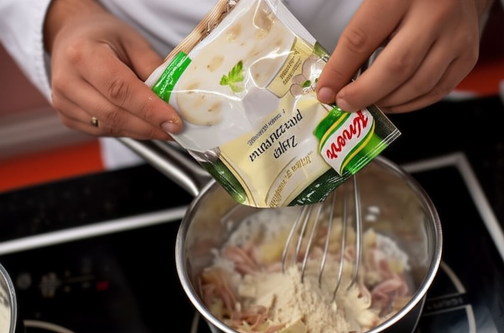 Dodaj zawartość torebki zupy pieczarkowej Knorr. Zamieszaj ostrożnie i umieść ponownie na ogniu. Podgrzewaj, nieustannie mieszając, aż do zagotowania. Potem gotuj jeszcze przez 10 minut.