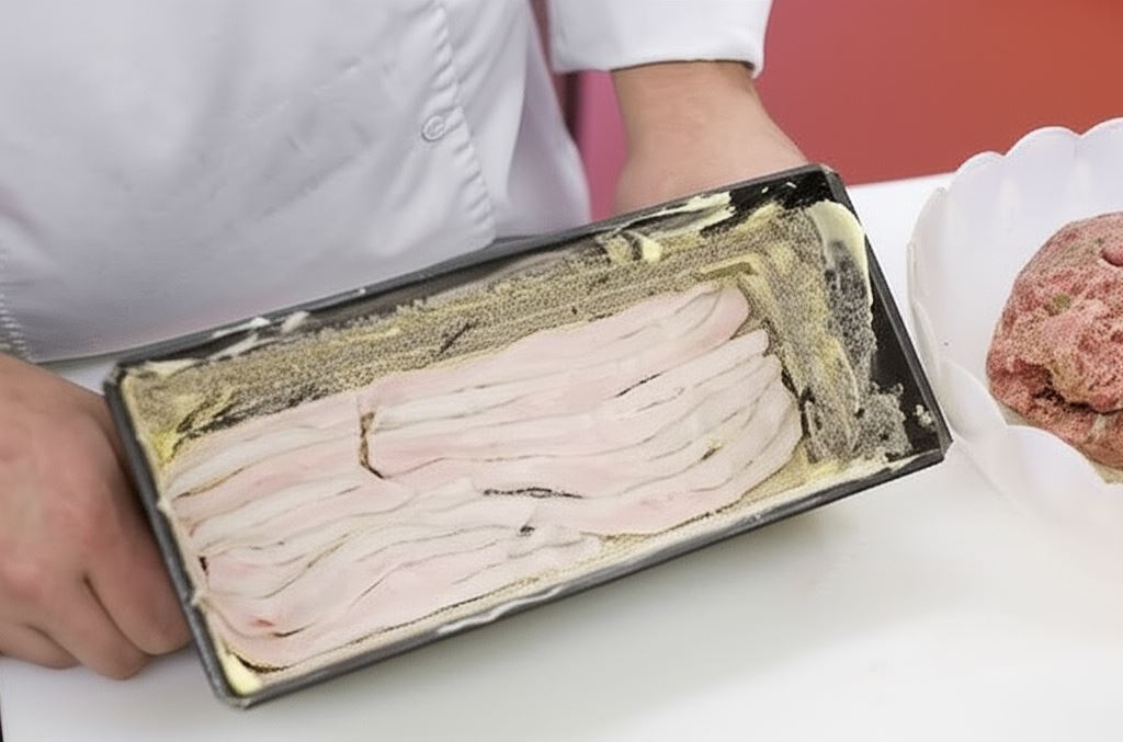 Naczynie żaroodporne, najlepiej o kształcie wąskiego prostokąta, posmaruj margaryną, obsyp bułką tartą i wyłóż plastrami słoniny.