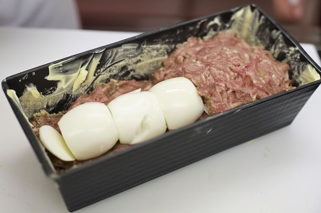 Okryj całkowicie jaja resztą farszu. Umieść w piekarniku i piecz przez godzinę w temperaturze 180°C. Po upieczeniu, wyjmij ostrożnie z formy i pokrój na plastry. Można serwować zarówno na zimno jak i na ciepło z sosem pomidorowym lub chrzanowym.
