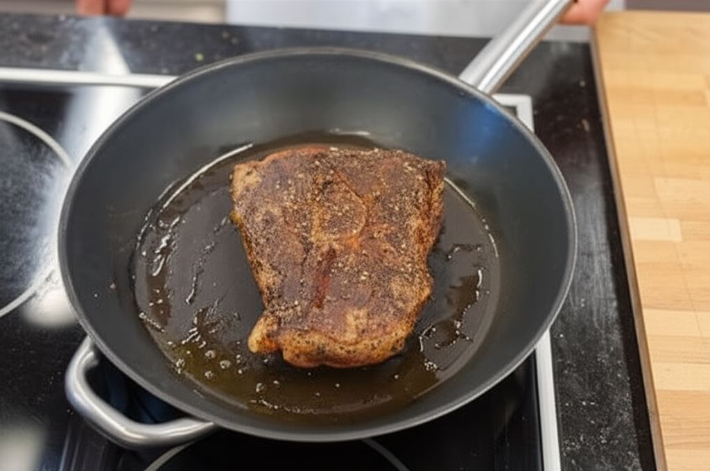 Mięso przysmażaj na gorącej patelni z każdej strony, po czym umieść w rozgrzanym do 180 stopni C piekarniku i piecz przez 50 minut. Jeżeli zależy ci, by twoja karkówka była jeszcze bardziej soczysta, po przysmażeniu zapiecz ją w folii aluminiowej albo w rękawie do pieczenia.