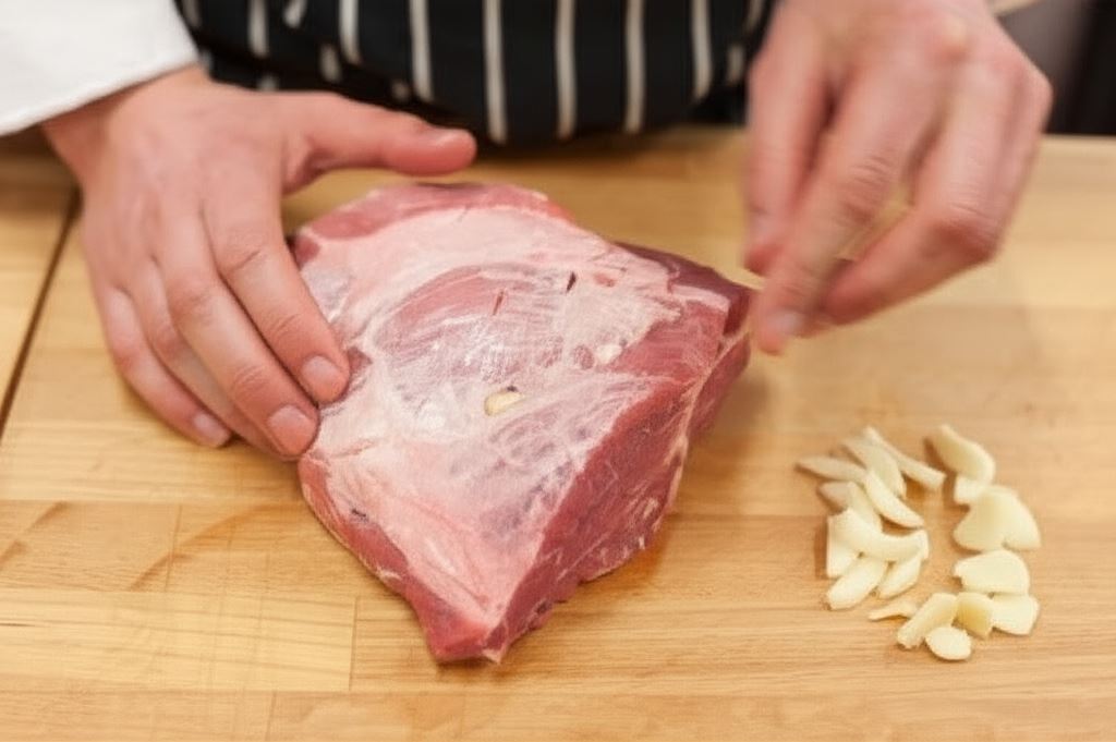 Czosnek obierz i potnij na plastry. Mięso ponakłuwaj cienkim nożem na około 2-3 cm, w utworzone 'kieszonki' włóż plaster czosnku. Zabieg powtarzaj dość regularnie wokół mięsa, umieszczając cały czosnek.