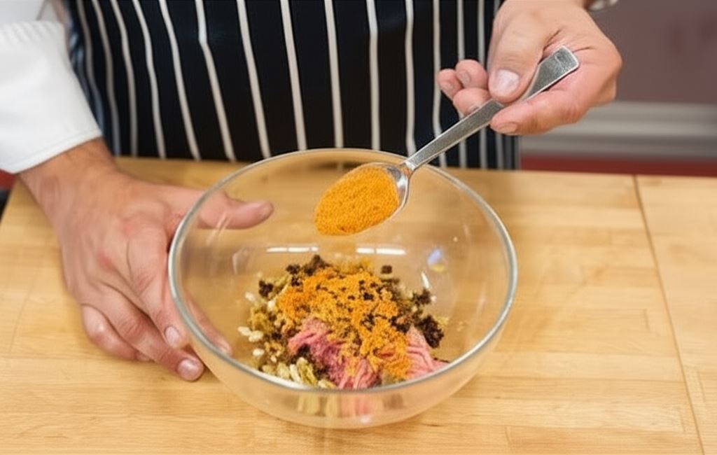 Mięso przypraw 1 łyżką przyprawy Knorr, wlej oliwę i całość dokładnie wymieszaj na jednolitą masę.