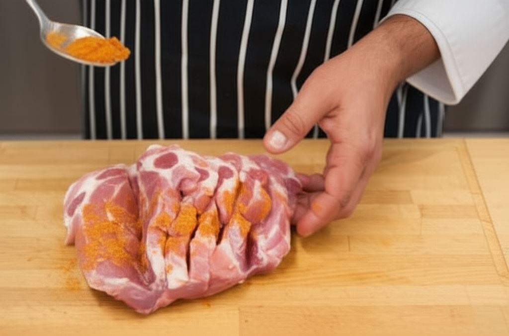 Karkówkę ponacinaj w poprzek na 6 jednakowych plastrów (nie przecinaj do końca), po czym posyp resztą Przyprawy do mięs Knorr – przypraw również utworzone kieszenie.