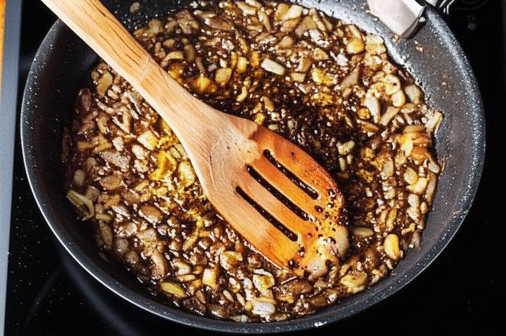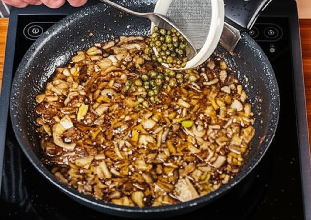 Na patelni pozostałej po smażeniu mięsa zrumień cebulę, potem wsyp odcedzony pieprz.
