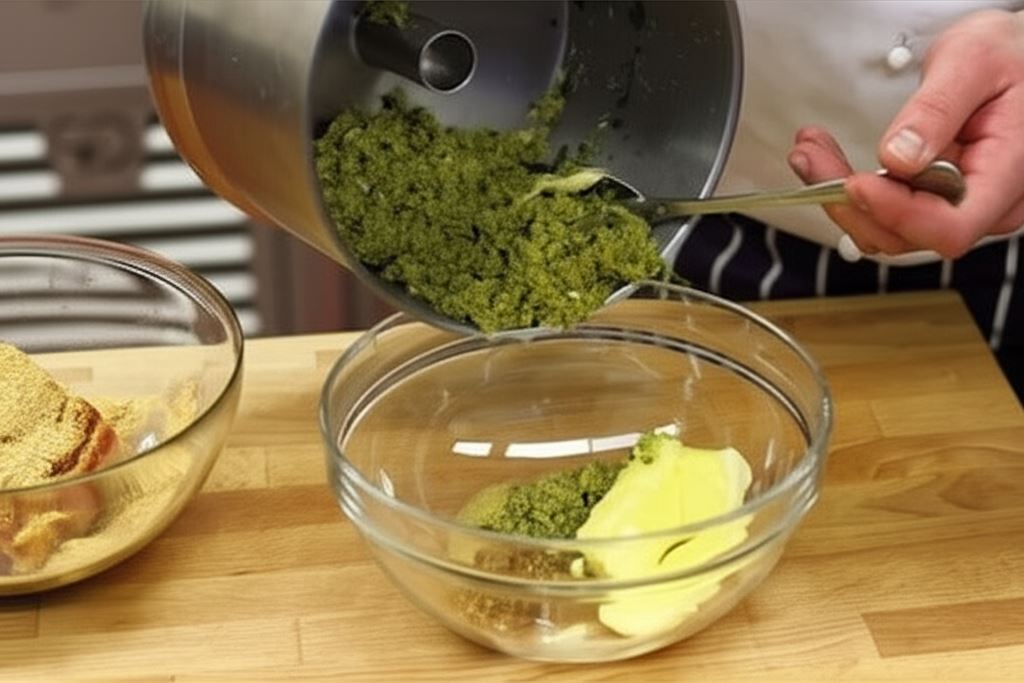 Zblendowane pieczywo wsyp do miski, po czym połącz z margaryną i musztardami.