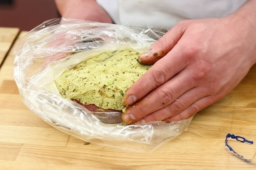 Wszystko dokładnie wymieszaj. Uzyskaną masę rozprowadź na powierzchni mięsa i porządnie dociśnij.