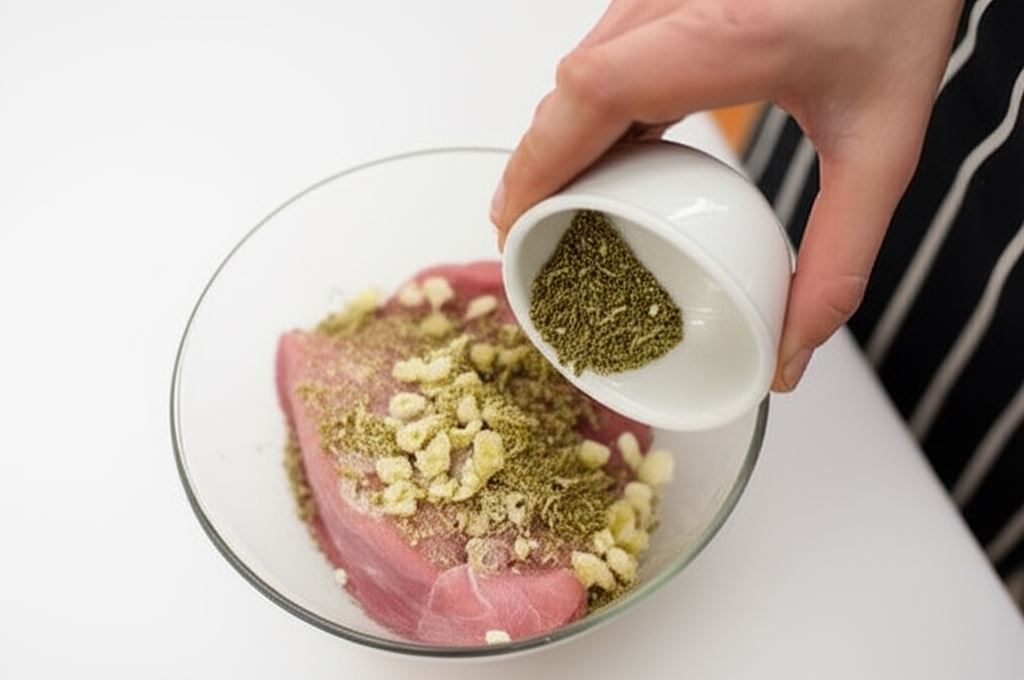 Mięso posyp solą, pieprzem, majerankiem i rozdrobnionym czosnkiem.