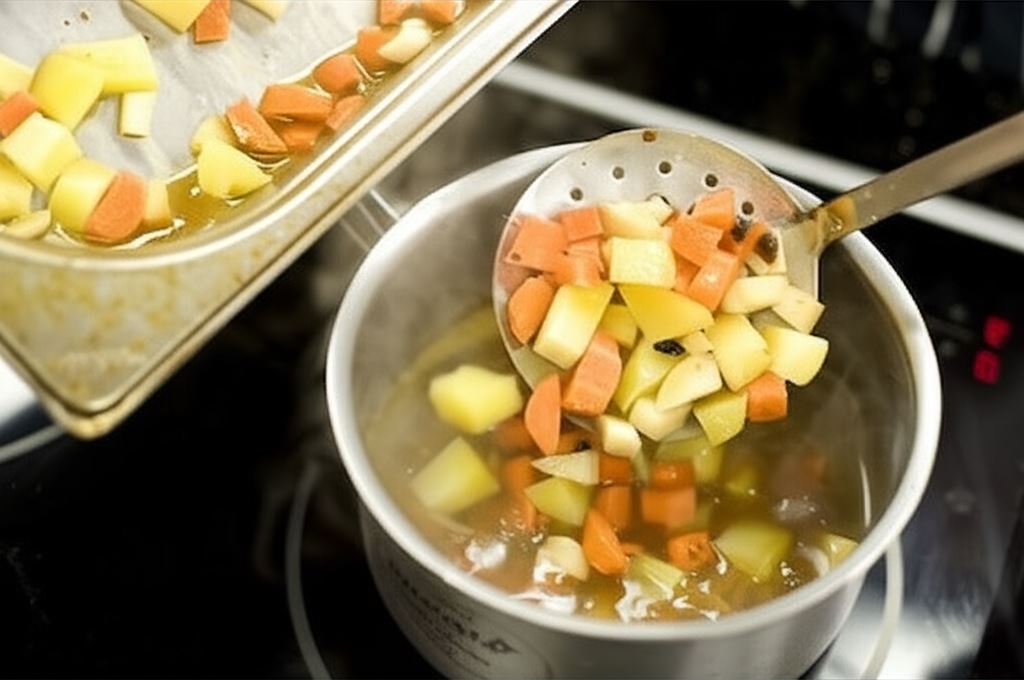 Ziemniaki, warzywa i mięso odłóż na bok. Sos przelej do garnuszka, dodaj czerwone wino i całość krótko pogotuj. Dodaj rozprowadzony w szklance wody sos Knorr.