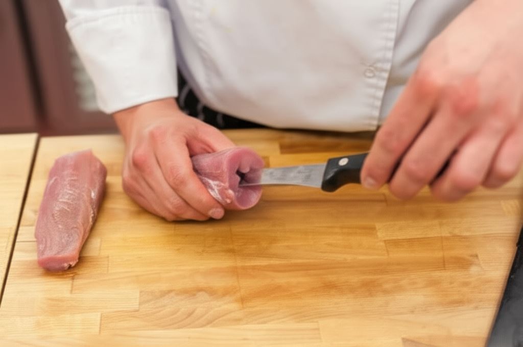 Polędwiczki oczyść z błonek i przetnij na pół wzdłuż. W każdej części wykonaj nacięcie długim, cienkim nożem, aby utworzyć otwór, który wypełnimy nadzieniem. Powinny wyjść cztery porcje mięsa.