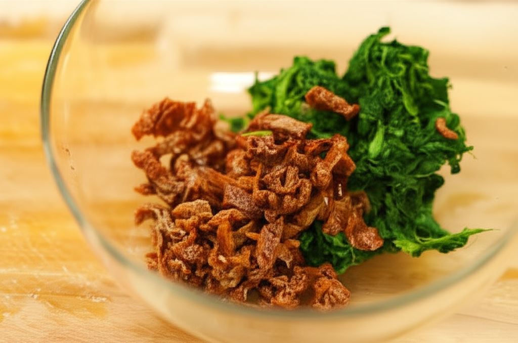 Szpinak odmroź, wyciśnij z nadmiaru wody. Suszone pomidory posiekaj drobno i wymieszaj ze szpinakiem.