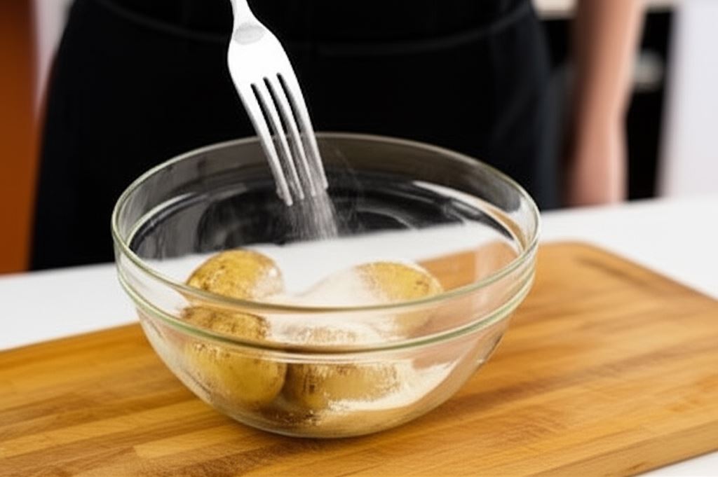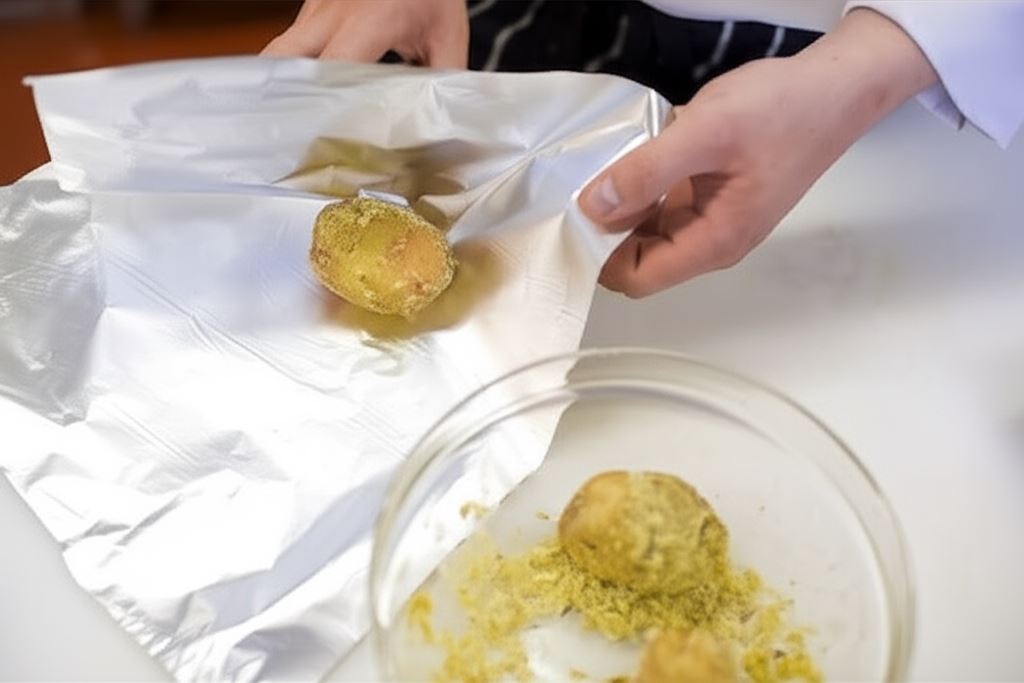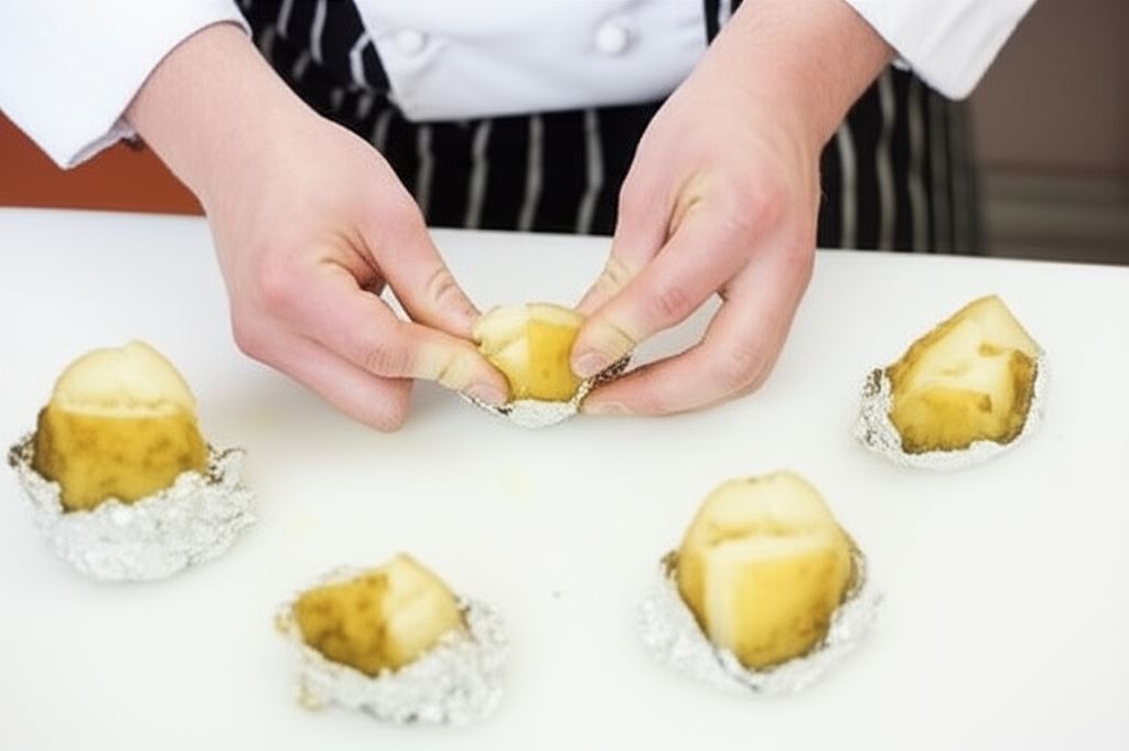 Kiedy ziemniaki będą upieczone i miękkie, zdejmij ostrożnie folię z góry. Potem przekrój ziemniaka nożem na krzyż. Używając palców, ściśnij ziemniaka w miejscu przecięcia, aby miąższ delikatnie wydobył się na zewnątrz.