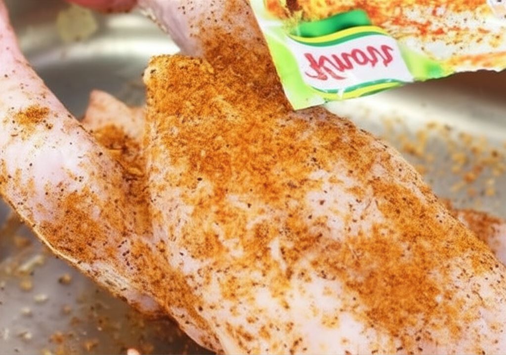 Kurczaka opłucz, wysusz, natrzyj od zewnątrz i od środka Naturalną przyprawą do kurczaka Knorr. Odstaw na godzinę w zimnym miejscu.