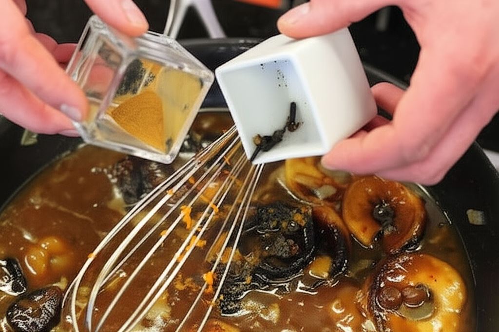Do sosu wsyp startą skórkę pomarańczową, dwa goździki oraz laskę cynamonu.