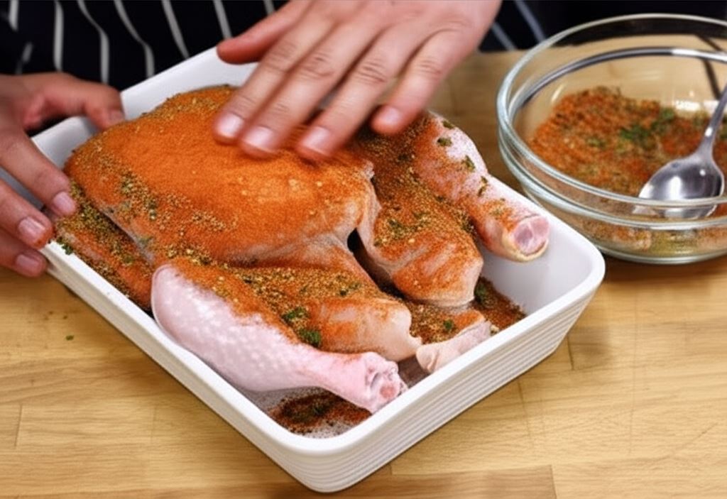 Wymieszaj przyprawę do mięs z majerankiem, papryką i posiekaną natką. Kurczaka opłucz i starannie osusz. Potem natrzyj go przygotowaną mieszanką przypraw.