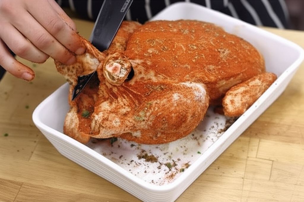 Skrzydła odwiń i odetnij nadmiar skóry od części szyjnej. Od strony tułowia zrób nacięcia w skórze i umieść w nich nogi kurczaka na krzyż.