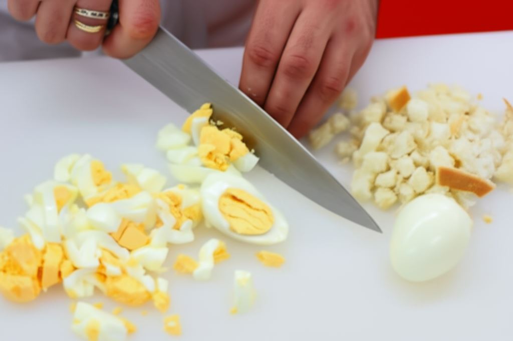 6 jajek ugotuj na twardo, ostudź i posiekaj. Bułkę kajzerkę pokrój w kostkę 1x1 centymetr.