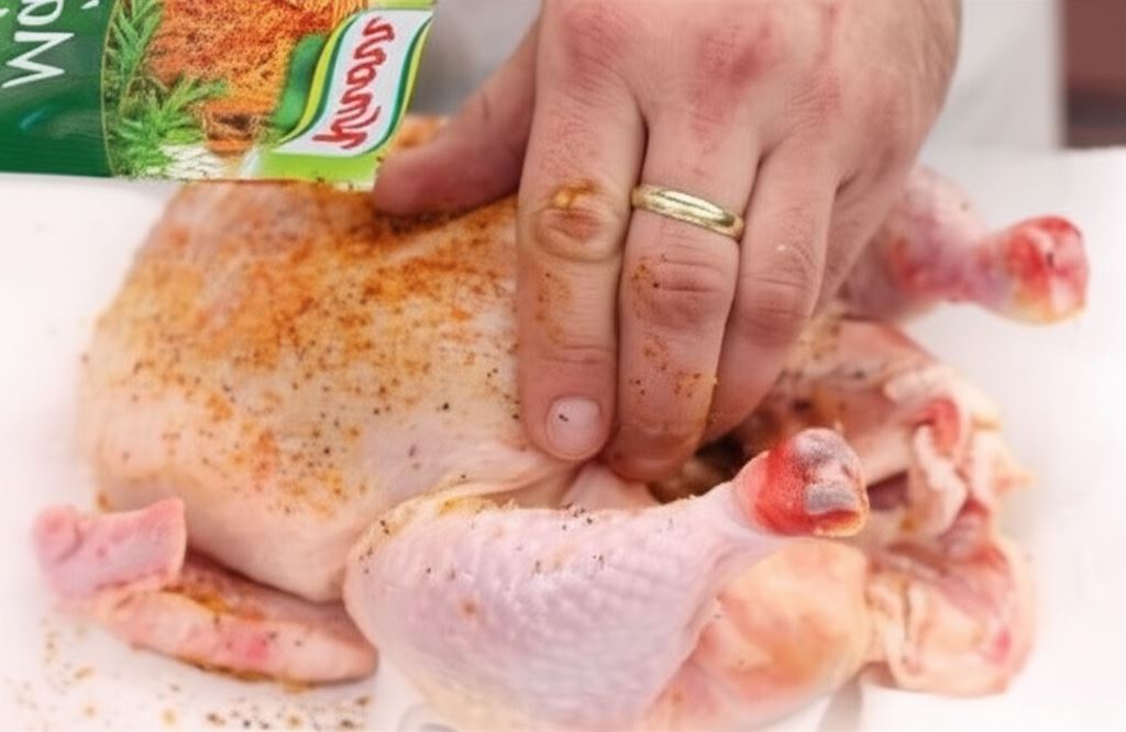 Kurczaka oczyść i starannie opłucz. Potem natrzyj dokładnie przyprawą Knorr wewnątrz i na zewnątrz.
