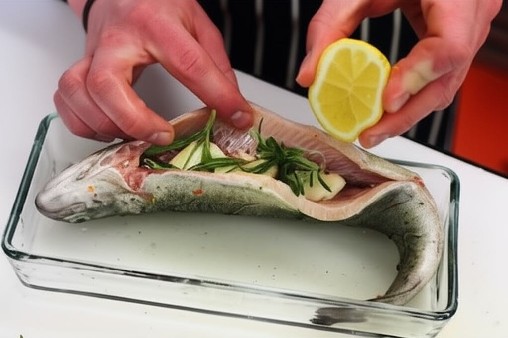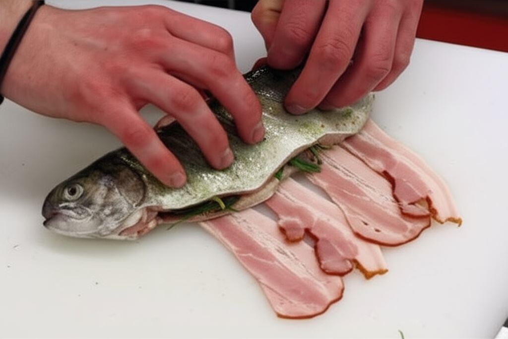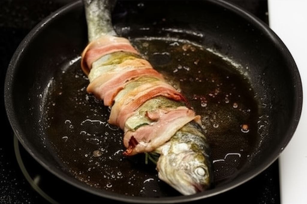 Pstrąg to jedna z najpopularniejszych ryb słodkowodnych w Polsce, ceniona za delikatne, białe mięso bogate w wartości odżywcze. Podany w całości z głową i ogonem nie tylko wygląda efektownie, ale zachowuje też więcej smaku podczas pieczenia. Otulenie ryby boczkiem to sprytny sposób na zachowanie jej soczystości.