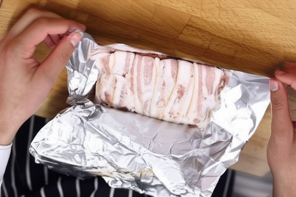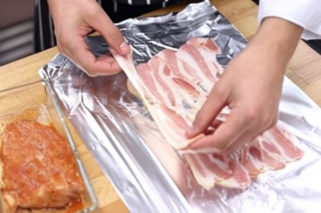 Na desce kuchennej rozłóż folię aluminiową, posmaruj delikatnie oliwą i ułóż plastry boczku.