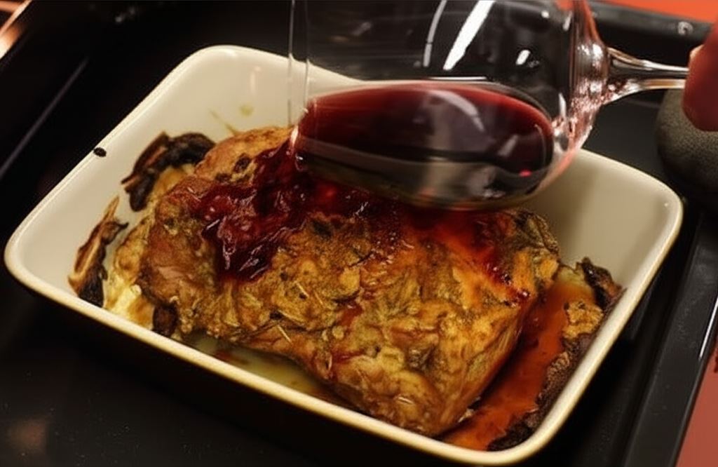 Wypiekaj w rozgrzanym piekarniku w temperaturze 190°C przez około 60 minut, skrapiając od czasu do czasu czerwonym winem.