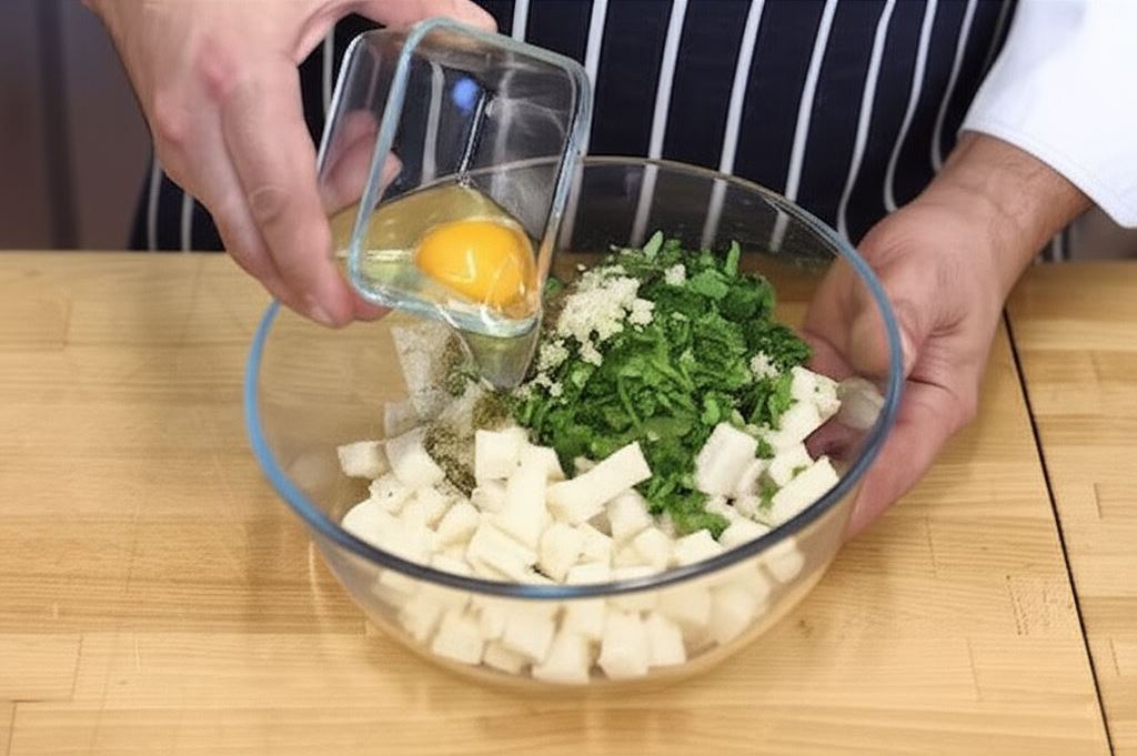 Pieczywo potnij w niewielką kostkę i umieść w misce. Dodaj posiekane zioła i czosnek, bulion oraz jajko. Całość dokładnie wymieszaj i przypraw do smaku pieprzem.