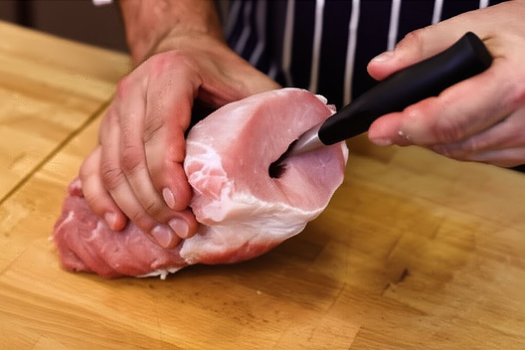 Mięso oczyść z błonek, a potem wąskim nożem wykonaj otwór przez środek schabu na wylot. Natrzyj mięso przyprawą do mięsa.