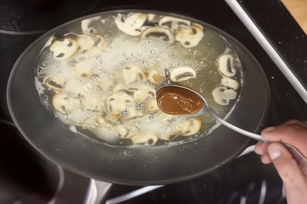 Pieczarki pokrój na grube plastry i podsmaż na tej samej patelni. Dolej szklankę zimnej wody, zdejmij patelnię z ognia i wsyp sos pieczeniowy ciemny Knorr. Zagotuj i gotuj przez kolejne 2-3 minuty. Po upieczeniu mięso pokrój w plastry i serwuj z uzyskanym sosem pieczarkowym.