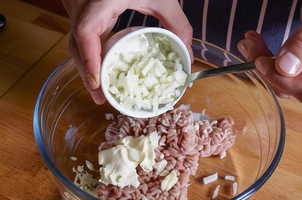 Rozpocznij od przygotowania farszu. Mięso powinno mieć temperaturę pokojową. Cebulę i czosnek drobno posiekaj. W miseczce wymieszaj mięso wieprzowe z jagnięcym, cebulą, czosnkiem oraz dwoma łyżkami masła.