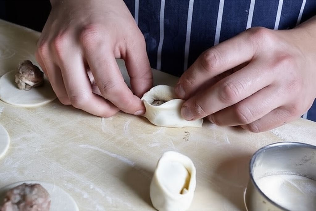 Rozwałkuj ciasto cienko, wytnij krążki i nałóż porcje surowego farszu. Zlep jak pierogi i połącz końce ze sobą, aby uformować okrągłe pielmieni.