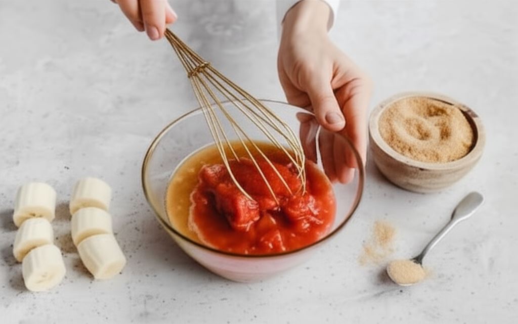 Piekarnik rozgrzewamy do 180 C. Do miski wlewamy olej, wrzucamy pokrojonego banana, pomidory z puszki oraz dodajemy cukier. Blendujemy wszystko aż uzyskamy puszystą masę.