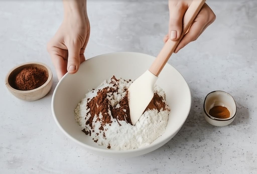 Do oddzielnej miski przesiewamy mąkę. Wsypujemy proszek do pieczenia, przyprawę piernikową, kakao, sodę i sól. Mieszamy aż składniki się połączą.