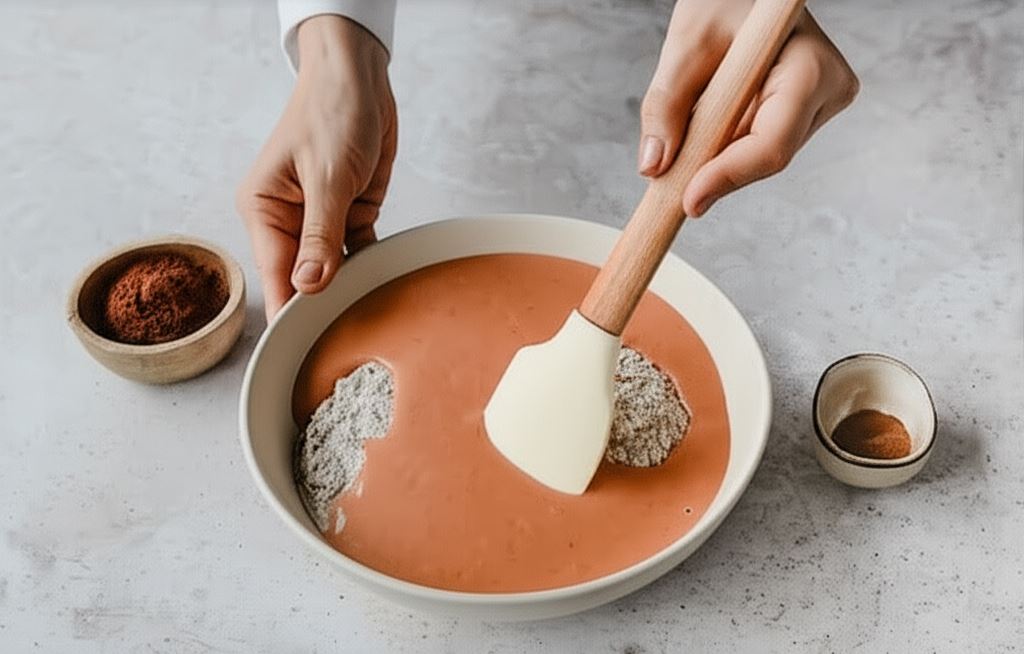 Płynne składniki dodajemy do sypkich i starannie łączymy przy pomocy szpatułki.