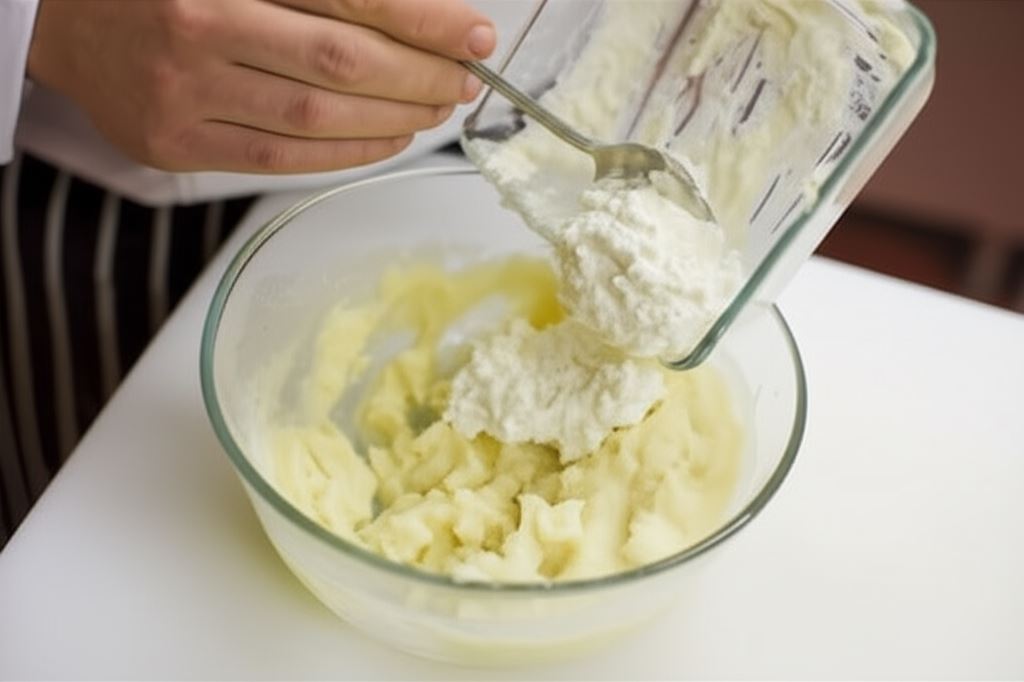 Twaróg, przepuszczony przez praskę, połącz szybko i energicznie z żółtkiem, skrobią ziemniaczaną oraz mąką pszenną i cukrem waniliowym formując zwarte ciasto. Odstaw ciasto na 10 minut.