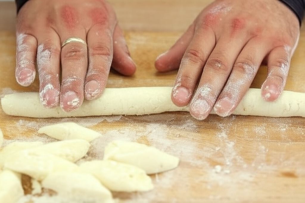Potem oprósz lekko mąką, rozdziel ciasto na mniejsze części i z każdej uformuj wałeczek.