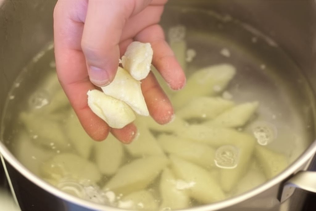 Pocięte pod skosem wałki ciasta podziel na mniejsze części. Potem gotuj je w wodzie przez 2-3 minuty.