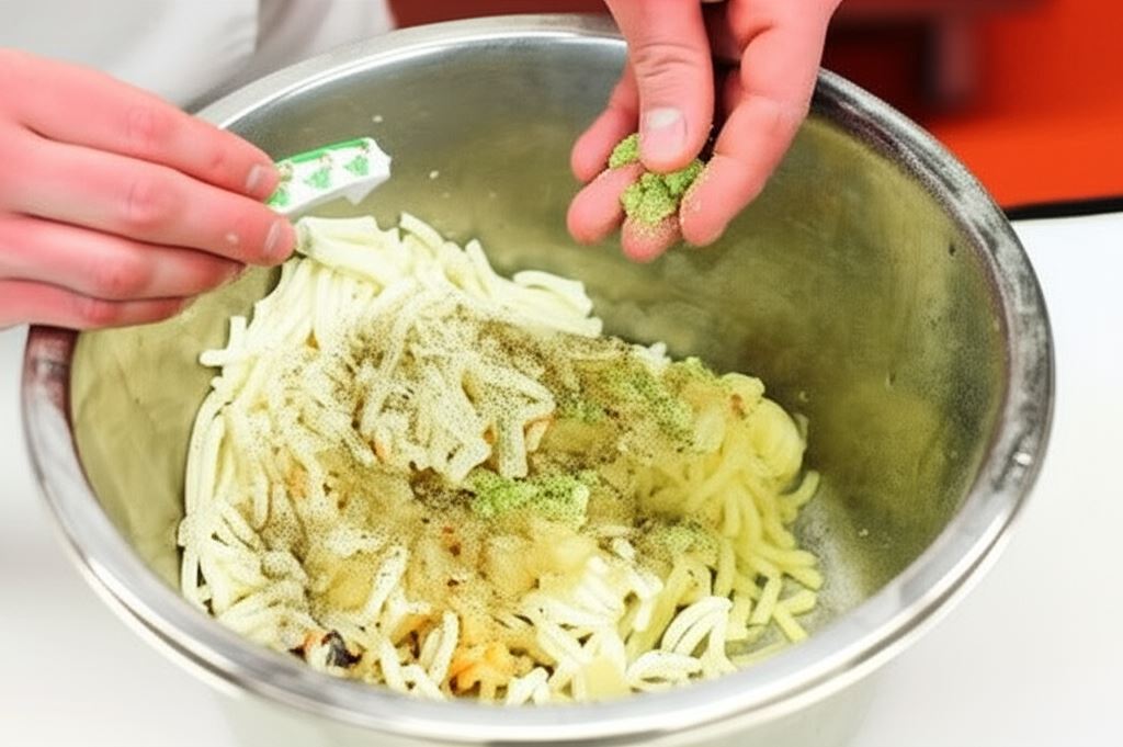 Ugotuj ziemniaki. Cebulę posiekaj w kostkę i zeszklij na patelni. Ostudzone ziemniaki zmiel w maszynce razem z twarogiem i cebulą, wsyp pokruszoną mini kostkę Knorr i dodaj pieprz.