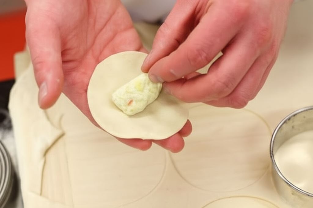Podziel ciasto na parę części, każdy kawałek wałkuj cienko i wycinaj z niego krążki o średnicy około 5 centymetrów. Na środek krążka nakładaj nadzienie. Zaginaj na pół, dokładnie sklejając brzegi.