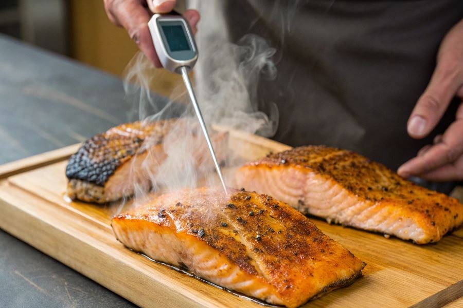 Najdokładniejszą metodą sprawdzenia gotowości łososia jest użycie termometru kuchennego – idealna temperatura wewnętrzna wynosi 50-55°C dla średnio wypieczonego łososia. Alternatywnie możesz zastosować metodę widelca – delikatnie naciśnij mięso widelcem; gdy łatwo się rozdziela na płaty i ma jednolity, nieprzezroczysty kolor, jest gotowe.