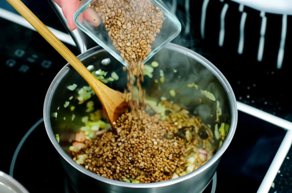 W rondlu zrumień pokrojony w kostkę boczek. Kiedy wytopi się o połowę wsyp pokrojoną w kostkę cebulę i posiekany czosnek. Całość razem smaż moment. Wsyp kaszę i rozdrobnione na małe kawałki grzyby.